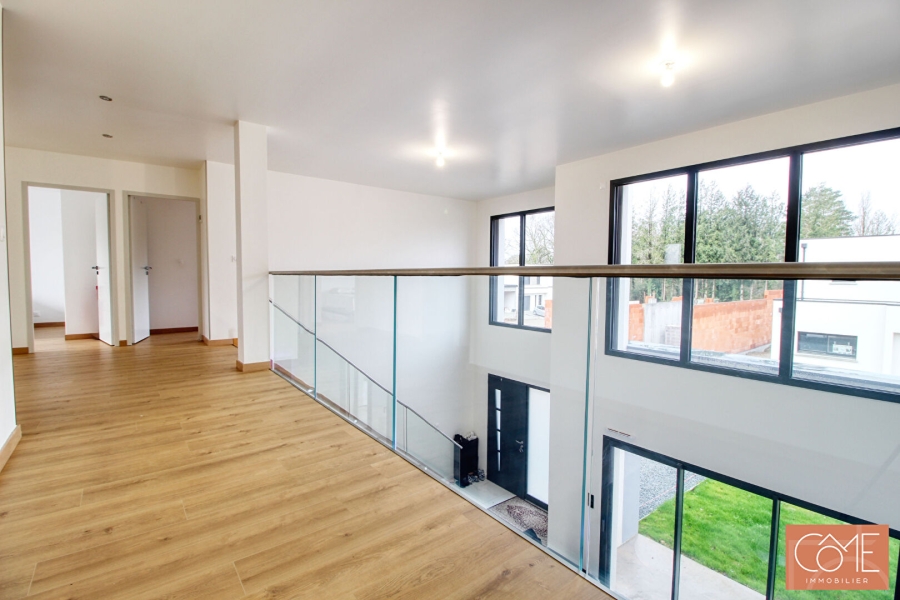 A VENDRE SAINT ERBLON - TRES BELLE MAISON MODERNE ET CONTEMPORAINE DE 2023 - 4 CHAMBRES - TERRAIN 401 M² Côme Immobilier vous propose en exclusivité cette superbe maison contemporaine, construite en 2023, idéalement située à seulement 10 minutes à pied du centre bourg de Saint-Erblon. - Architecture moderne et lignes épurées - Dès les premiers instants, vous serez séduits par l'allure résolument contemporaine de cette maison, sublimée par des matériaux de qualité et un design soigné. - Vaste pièce de vie lumineuse - La pièce de vie de 60 m², baignée de lumière naturelle, se compose de trois espaces bien définis, parfaits pour partager des moments chaleureux en famille ou entre amis. - Suite parentale au rez-de-chaussée - Le rez-de-chaussée abrite une belle suite parentale avec dressing et salle d'eau privative, garantissant confort et intimité au quotidien. - Espace nuit à l'étage - L'étage s'ouvre sur une agréable mezzanine, idéale pour un bureau ou un coin lecture avec vue sur le salon. Trois chambres avec rangements intégrés complètent cet espace, dont une avec salle d'eau privative et deux avec accès à un balcon. Une belle salle de bain indépendante et un WC viennent parfaire l'ensemble. - Jardin ensoleillé et terrasses - Profitez pleinement des extérieurs avec un jardin orienté sud-est et plusieurs terrasses propices à la détente et aux repas en plein air. - Garage et stationnement - Un garage fermé avec accès direct à la maison ainsi que deux places de stationnement devant la propriété assurent praticité et confort au quotidien. - Emplacement recherché - A seulement 12 km de Rennes et proche d'une station de métro, cette maison bénéficie d'un emplacement idéal, alliant calme résidentiel et proximité immédiate des commodités. Cette maison contemporaine est une véritable pépite. Ne manquez pas cette opportunité unique de poser vos valises dans un cadre de vie à la fois moderne, chaleureux et pratique. Consulter une partie de nos offres sur come - immobilier.fr Tous nos biens ne sont pas en ligne, n'hésitez pas à nous contacter directement Les informations sur les risques auxquels ce bien est exposé sont disponibles sur le site Géorisques : www.georisques.gouv.fr Réf. MM-2419 (3.90 % honoraires TTC à la charge de l'acquéreur.)